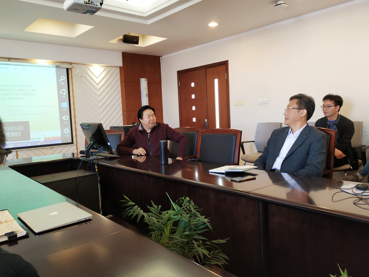 11月14日上午十点,中国社会科学院政治学研究所前副所长、中国政治学会前秘书长、博士生导师杨海蛟研究员以“新中国70年政治学的发展历程”为主题为我院师生做了一次精彩的学术报告,报告由海角网 特聘教授王岩主持,史宏波副教授、周凯副教授及十余名硕博研究生参加。