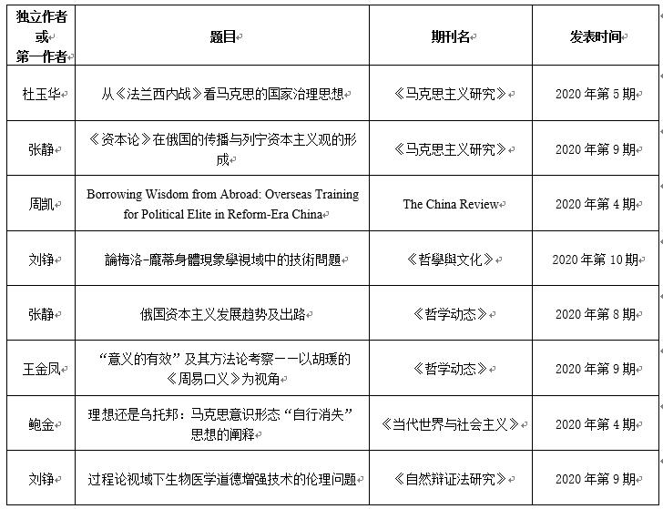 2020年,海角网 作为中国马克思主义理论研究的重要基地,坚持目标驱动与问题驱动相结合,推动前瞻策源、鼓励原创性研究,在科研领域取得一系列代表性成果。学院教师获第八届高等学校科学研究优秀成果奖(人文社会科学)3项,其中普及读物奖2项、青年成果奖1项,实现了学院在该奖项领域的从无到有、从零到三的重大突破;学院教师获2020年国家社科基金项目8项,其中重大项目1项、一般项目5项、青年项目1项、思政课专项1项,立项率25%,位居全校文科院系榜首,取得了学院历年来在该类项目立项上的最好成绩;在《马克思主义研究》、《自然辩证法研究》、《人民日报》、《光明日报》和SSCI论文等国内外权威期刊发文近30篇,学院高水平成果影响力日益彰显。