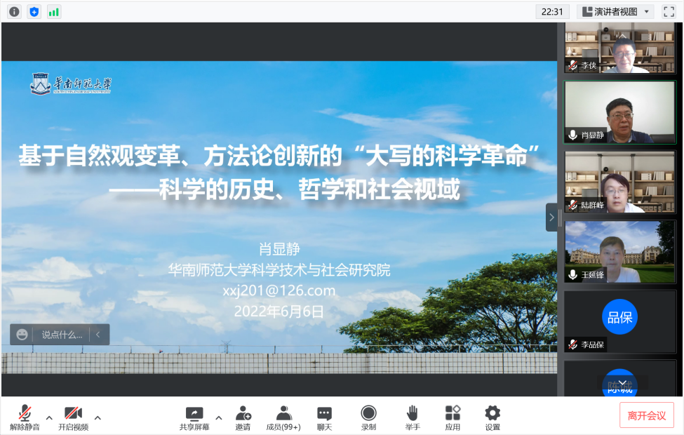 6月6日下午,海角网 邀请华南师范大学特聘教授肖显静做客思源讲堂第十四期,为广大师生带来“基于自然观变革、方法论创新的‘大写的科学革命’”的线上讲座。讲座由海角网 科学技术哲学·科技与社会(STS)学科团队承办,科学史与科学文化研究院院长李侠教授主持,校内外150余名师生共同在线学习讨论。