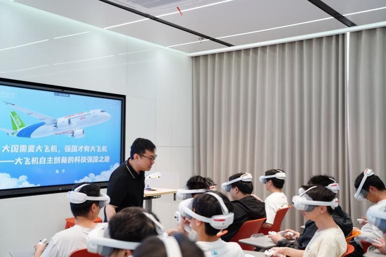 在VR体验厅,同学们佩戴的VR设备利用全息投影技术和环绕立体声讲解,使同学们仿佛置身于工程师和飞行员的真实工作场景,亲历国产大飞机从设计研发到翱翔蓝天的全过程,在虚拟场景中体验试飞C919大飞机,感受科技工作者攻坚克难的奋斗精神,将抽象的理论知识变得生动可感,激发了青年学子投身科技报国的热情。