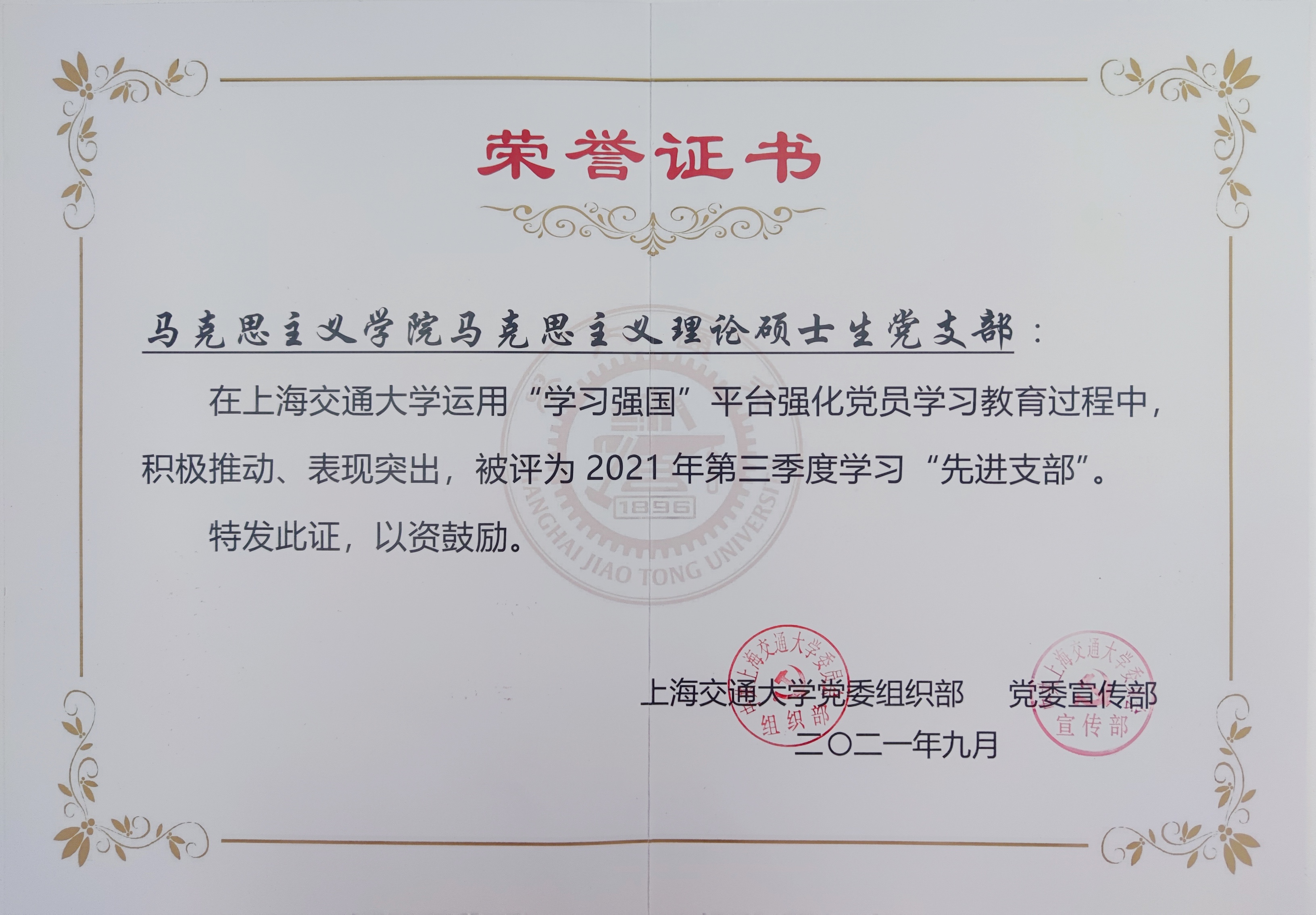 根据校党委宣传部“学习强国”第三季度积分评比结果,海角网 在本季度“学习强国”积分评比中,喜获两个集体奖、9个个人奖:学院党委获得“先进单位”,马克思主义理论硕士生党支部获得“先进支部”;刘欣然、邹萌、洪亮、张英英、闫艳芳、尚媛媛、许潇雨、马峥、高蓉等9名师生获得“学习达人”。