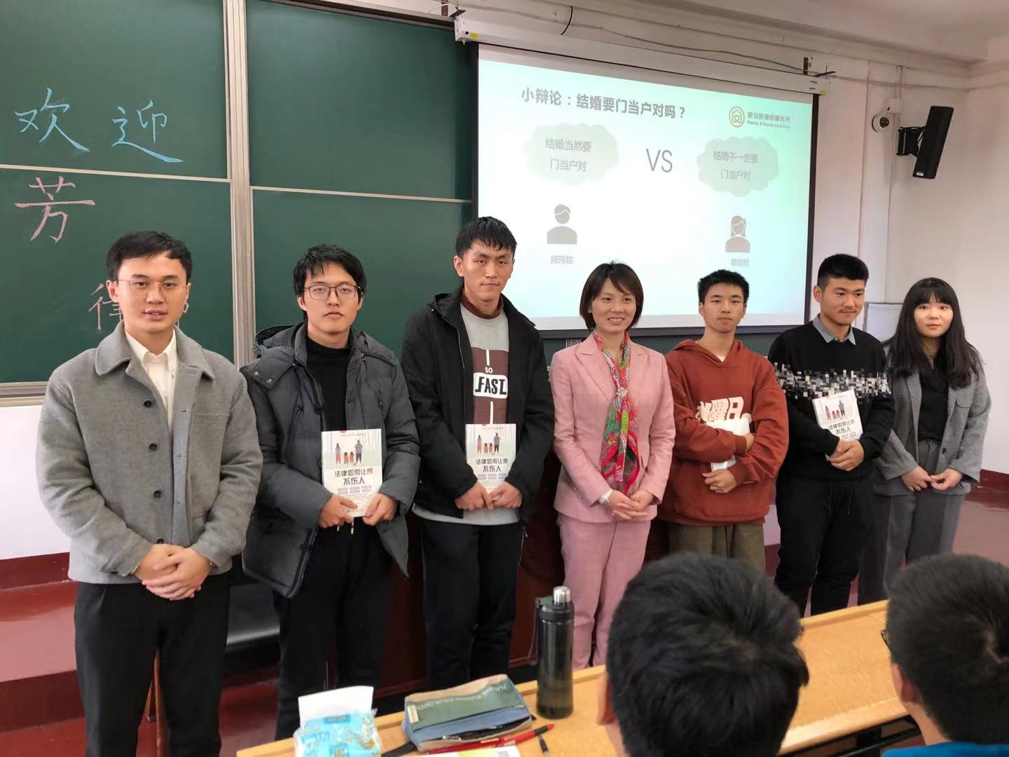 接下来,桂律师设计了一个小辩论:“结婚要门当户对吗”,由其带领的团队成员分别代表正方和反方进行发言。同学们紧接着对此进行了深入讨论,有四名同学代表上台加入辩论,生动地阐述了各自的观点,对婚姻的本质和意义提出了各自的见解。随后,桂律师评点了这一辩论话题中可能涉及到的一些法律要点,为同学们讲述了多个她亲手办理过的案例,包括彩礼嫁妆纠纷、婚前财产协议等等,并表示财产协议不是夫妻之间的锱铢必较,而是两人同仇敌忾、共同守护家园的一种姿态,她向同学们提出希望:我们应该拥有爱,拥有真诚,但绝不能被金钱所束缚。
