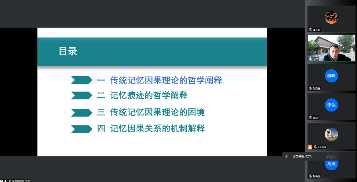 随后,尤洋教授进行了小结。他认为,随着传统记忆因果理论的逐步衰落,当代记忆的因果性研究更多地聚焦于机制解释的新视域之内,神经科学的方法论特征逐步渗透在以因果性为代表的记忆问题研究中,由此呈现出实在的以及颅内主义的神经科学哲学解释,这一研究进路不但能有效的规避记忆因果关系的偶然性,而且有助于建构出一条从现象到机制的新路径,对于破解“记忆虚幻”、探索包括大脑、行为和意识在内的记忆连接之谜,具有重要的研究意义和价值。