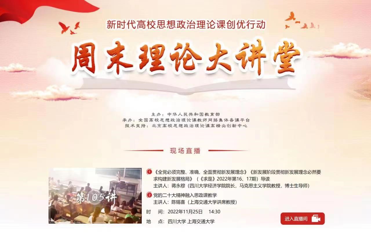 11月25日下午,我院讲席教授陈锡喜应邀在教育部主办、全国高校思想政治理论课教师网络集体备课平台“周末理论大讲堂”,以“党的二十大精神融入思政课教学”为题为全国高校思想政治理论课教师作了报告。