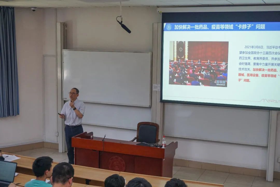 在中院115教室,药学院副院长钱峰教授从宏观和微观两个角度,系统介绍了如何通过中国原创药积极服务“健康中国”战略,并鼓励同学们将自己的专业知识和实践经验为建设“健康中国”贡献青春力量。