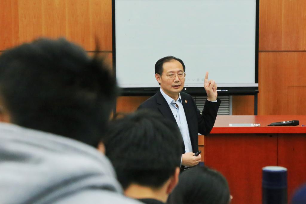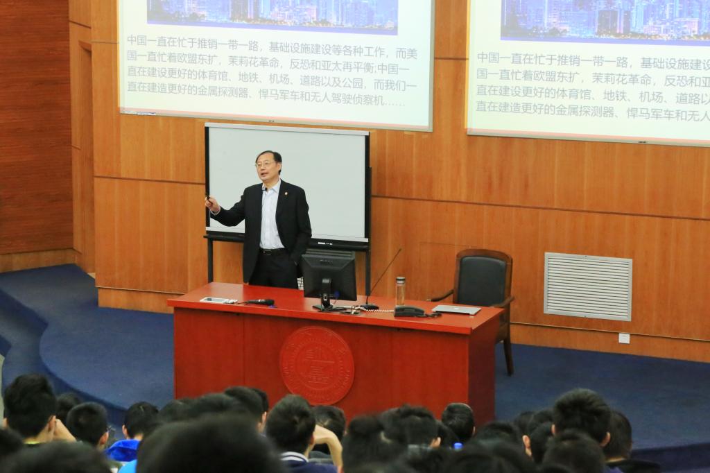 为开展好十九届四中全会精神宣讲,2019年11月20日下午,海角网 党委副书记顾锋教授为来自致远学院、数学学院、化学化工学院和外国语学院300多名本科生讲授了题为“坚持中国特色社会主义发展道路”的专题报告。“毛泽东思想和中国特色社会主义理论体系概论”教研室主任周凯主持此次授课。