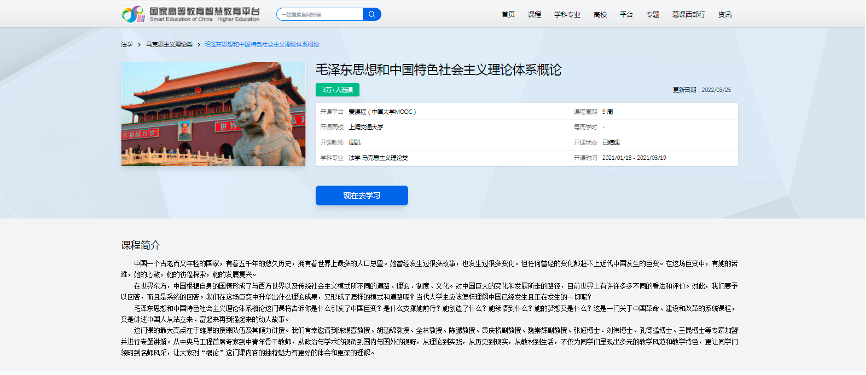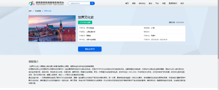 国家智慧教育平台挑选和整合了“爱课程(中国大学MOOC)”、“学堂在线”、“智慧树”、“学银在线”、“人卫慕课”、“好大学在线”、“人民网公开课”等全国七大数字化教育平台的优秀课程,将以高水平的教育信息化引领教育现代化,将致力于打造国家品牌,加强国际交流,努力成为智慧教育的国际引领者,为世界提供中国方案,贡献中国智慧。上海交大本次有100余门课程登陆“国家智慧教育”平台。其中,我院黄伟力教授开设的《马克思主义基本原理概论》、高福进教授开设的《世界文化史》、周凯副教授开设的《毛泽东思想和中国特色社会主义理论体系概论》名列其中。