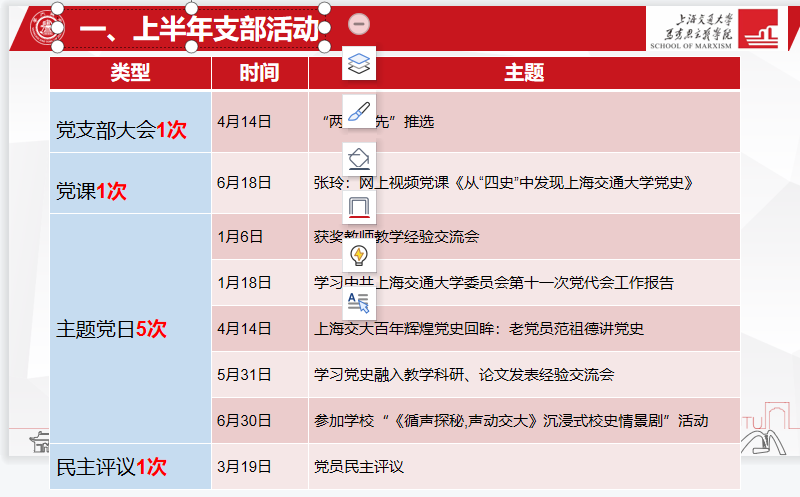 党支部按照学院党委要求,认真总结2021上半年党史学习教育活动情况,支部共举行八次相关活动,其中,党支部书记上党课一次,党史教育专题活动五次。
