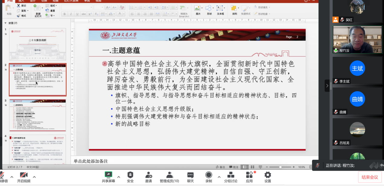 会上,首先由程竹汝老师领学解读二十大报告,程老师从二十大报告的主题意蕴、结构特色和新的重要论述三个方面对报告进行了系统的解读,并将二十大报告与党的十九大报告进行比较分析,为老师们全方位把握二十大精神和要义提供了重要帮助。