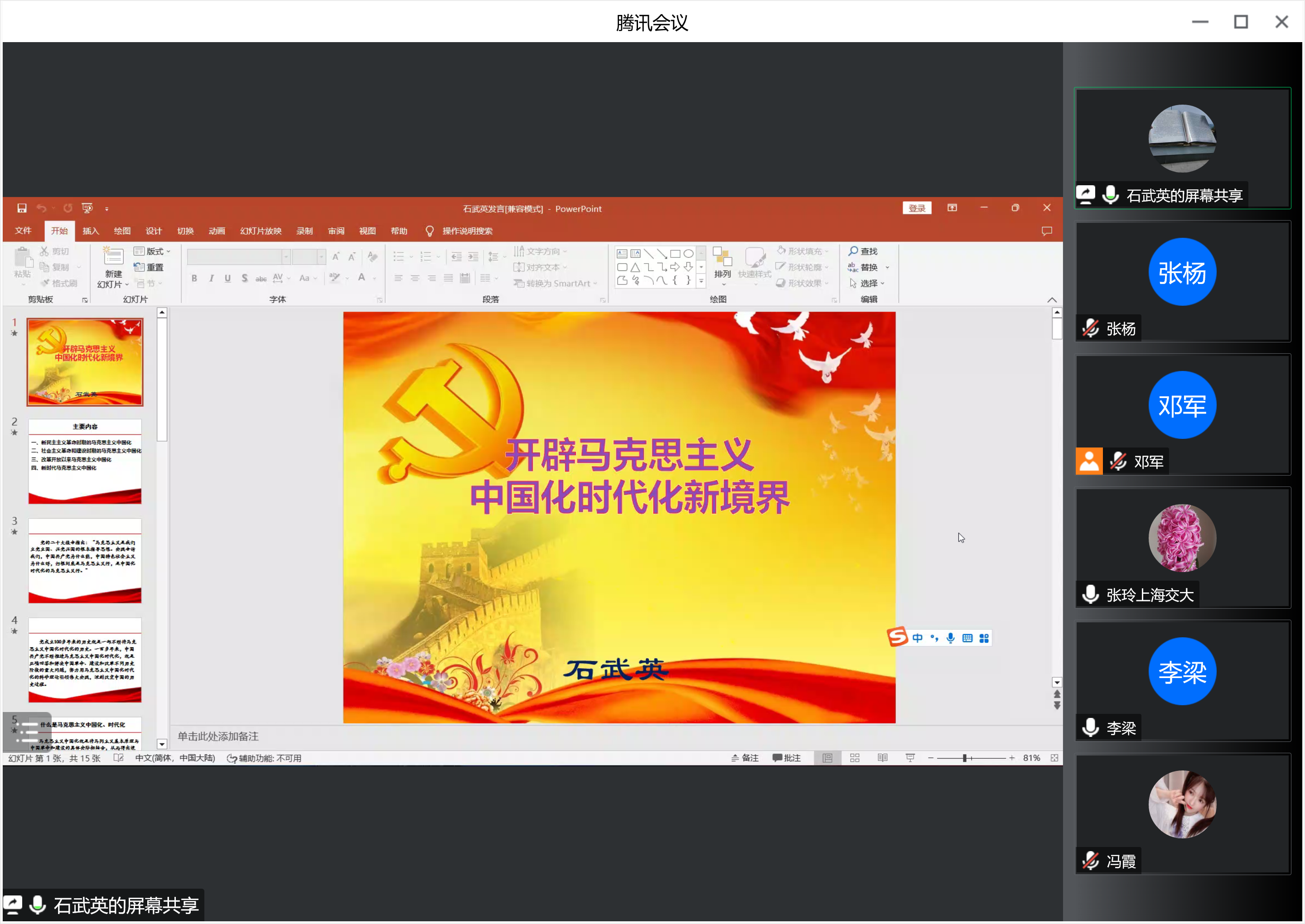 2023年2月10日,新学期开学前夕,党支部举行线上主题党日活动,汇总上学期举办主题党日案例活动“把党的二十大报告内容和精神融入教学”形成的系列成果,贯彻落实于教学之中。彭正德、石武英、冯霞、赖锐、张杨等老师作为代表进行重点发言。他们把党的二十大报告与“纲要”教材相对照,有序展示“中国式现代化”、“马克思主义中国化”、“三个务必”及“区域发展及安全观”等融入的具体章节,既有史料支撑,又有理论深度。